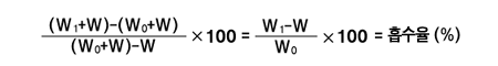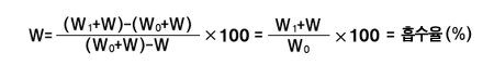 | 시료를 미리 연구해서 정도 0.85mm이하로 하고 잘 혼합하여 150~170˚C에서 2시간 가열후 그의 0.5~1g를 재빨리 무게다는 병(중량W)의 밑 전면에 되도록 균등한 두께로 펼치어 즉시 뚜껑을 덮고 데시케이터 속에서 실온까지 냉각시킨다. 다음에 이것을 평량하여 W0 +W라하고 한국공업규격에 규정하는 관계습도 20%, 50%, 90%를 유지하기 위하여 각각다음 표에 규정하는 황산수용액을 넣은 유리제 밀폐기속에 뚜껑을 열고 넣어 습도 25~30˚C로 48시간 유지한 후 이것을 집어내어 즉시 뚜껑을 덮고 평량하여 이것을 W1+W라 하고 다음 식에 의해 흡수율을 계산한다. | ||||||||||||||||||||||||||||||||||||||||